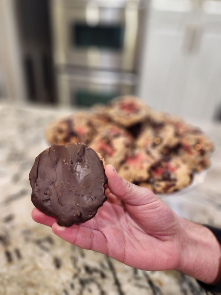 - Once cookies are fully cooled, carefully dip the bottoms on the cookies in the melted chocolate, then place on parchment paper to set. Transfer all the cookies to the fridge for 10 minutes once dipped in chocolate to fully set.