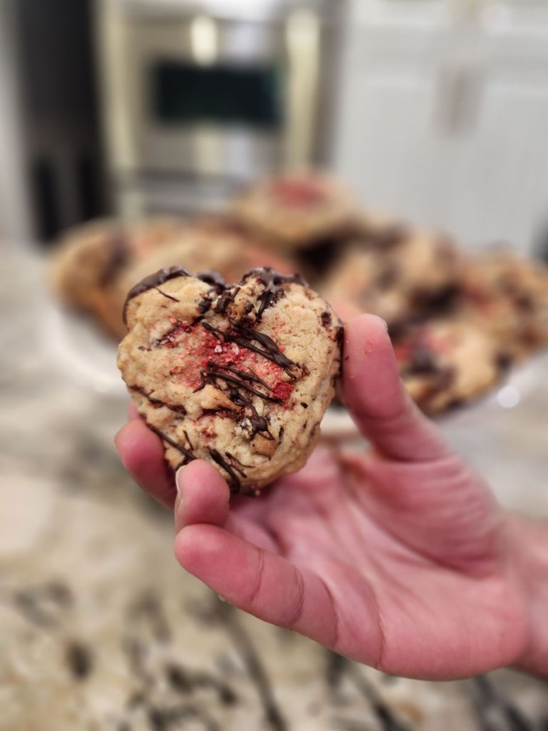 Do you like chocolate chip cookies? Do you like chocolate covered strawberries? Well, do I have the cookie for you! This cookie takes your regular chocolate chip cookie and adds freeze dried strawberries into the dough for the perfect strawberry crunch. While I originally made these for Valentine’s Day, it’s a perfect addition to any cookie tray. I found these cookies through Kelsey Oppenheim’s Instagram she also has a website with tons of other recipes.